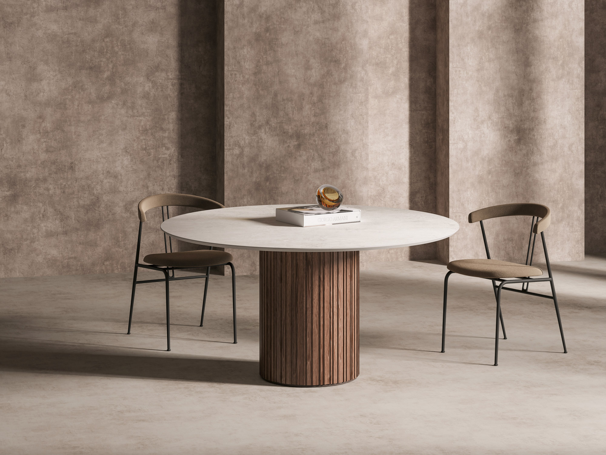 Tavolo Luna Romano is a Dining table with wood strip decor. Tavolo Luna Romano, a luxurious and elegant addition to any dining room. The table’s clean lines are beautifully balanced by contrasting tones, creating a striking and sophisticated look. The elegant round top dining table is supported by a single pillar base that can be customised to your taste with a selection of colour combinations and finishes. The top has a diameter of 1450 mm and the base is 450 mm making this table perfect for any high-end dining room. Tavolo Luna Romano is manufactured at our design studio in approximately 6-10 weeks. Each item is made-to-order and can be specified with an array of colours and syles. Please see specification below. The sizes shown are representative only, as your item will be made to your specific size and fitment requirements. Parameters for width, height and depth (w x h x d) measurements are quoted as a guide.