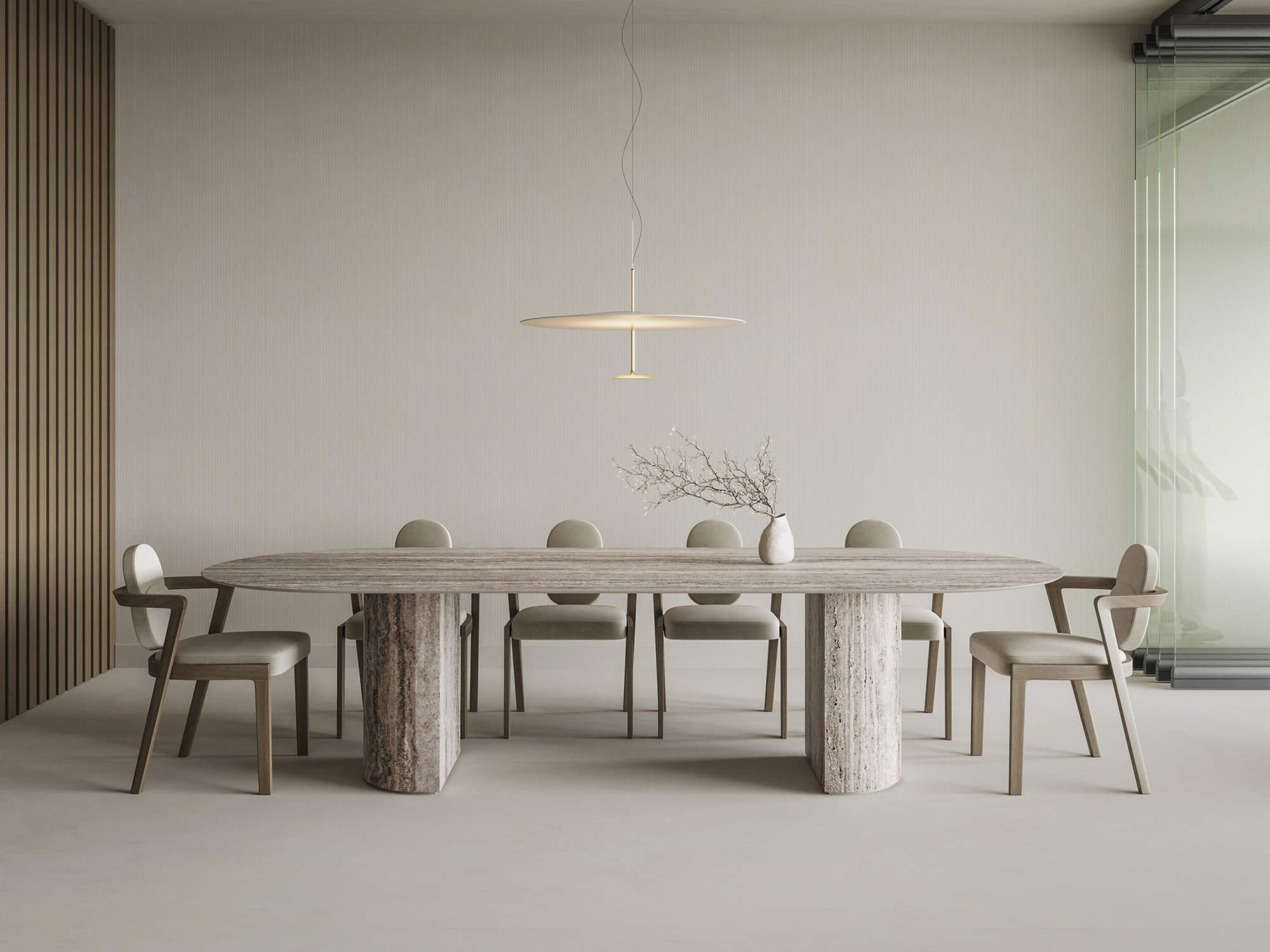 Tavolo Mezzaluna Veneziana is a dining table with strip decor legs. Introduce a touch of contemporary elegance to your dining room with the Tavolo Mezzaluna Veneziana. This statement piece showcases a sleek modern design with a grand, expansive top and a twin semicircular base. The table can be customised to suit your taste with a variety of finishes and colour variations available. The table design and its unique detail make it the perfect centerpiece for any luxurious dining room. Tavolo Mezzaluna Veneziana is manufactured at our design studio in approximately 6-10 weeks. Each item is made-to-order and can be specified with an array of colours and syles. Please see specification below. The sizes shown are representative only, as your item will be made to your specific size and fitment requirements. Parameters for width, height and depth (w x h x d) measurements are quoted as a guide.
